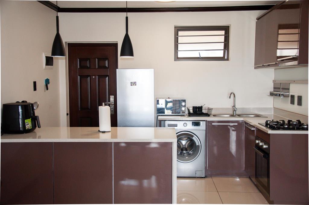 Upon entering, youre welcomed by a sleek and contemporary kitchen featuring a gas hobperfect for efficiency and uninterrupted cooking during loadshedding. The light stone countertops and breakfast nook create a stylish yet functional space for preparing and enjoying meals with loved ones.