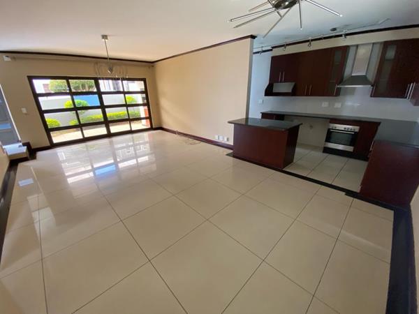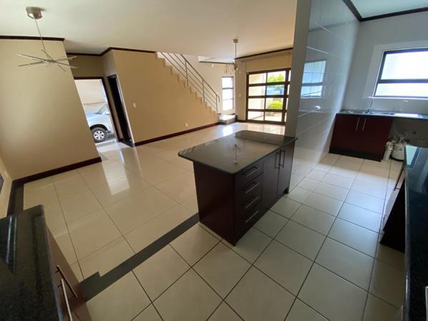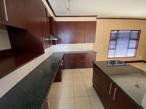 Downstairs this stunning family home has a large open plan living room that can comfortably fit a large L-shape or U-shape lounge suite as well as a 8-12 seater dining room set with a semi-closed off kitchen with lots of cupboard space, 3 undercounter appliance spaces as well as space for a double door fridge. The living room opens onto a covered patio with a built-in braai along with a decently sized wrap-around garden which is pet friendly by landlord body corporate approval.