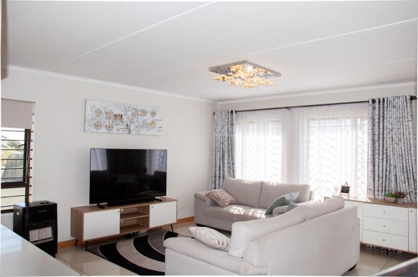 The double-storey home boasts 181 square meters under the roof. The kitchen, lounge and dining spaces have been designed with a modern open plan configuration that flows seamlessly into each other and out onto your covered patio and wrap-around well-maintained garden. The kitchen has ample storage space, Caesarstone counters, gas hob, electric oven, space for two under-counter appliances and a large double door fridge.