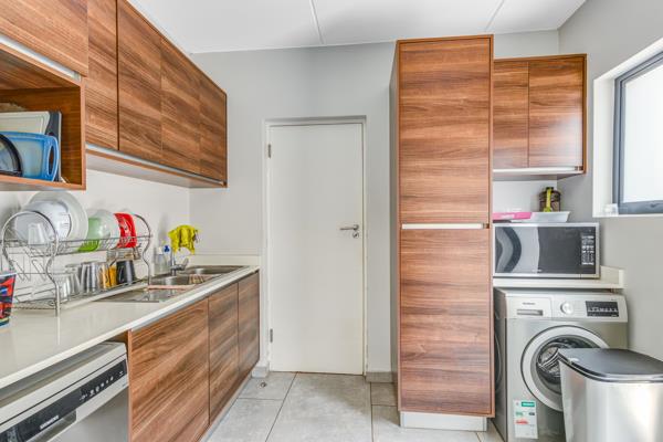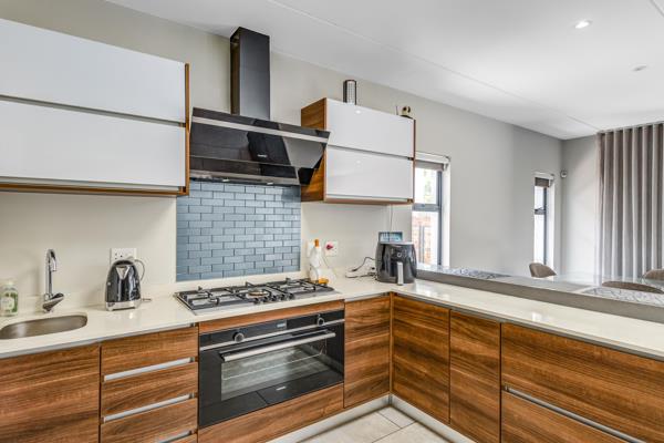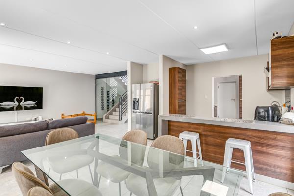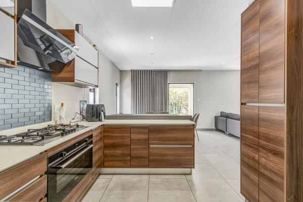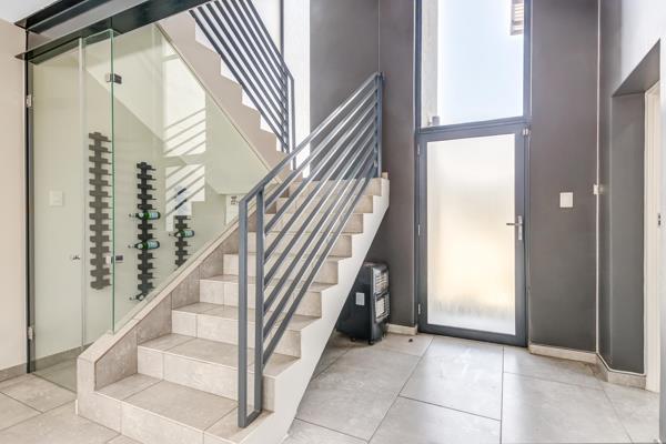 The home features four sunny bedrooms with sleek laminate flooring and four beautifully finished bathrooms, including a main en-suite and a convenient guest cloakroom downstairs. The modern kitchen is fitted with granite countertops, a gas stove, a separate scullery and elegant dark-wood cabinetry, flowing effortlessly into the open-plan lounge and dining area. This light-filled space showcases a striking glass-enclosed wine cellar and leads out to a covered patio and a private, pet-friendly garden subject to approval. A double automated garage provides secure parking and includes built-in cupboards for additional storage.