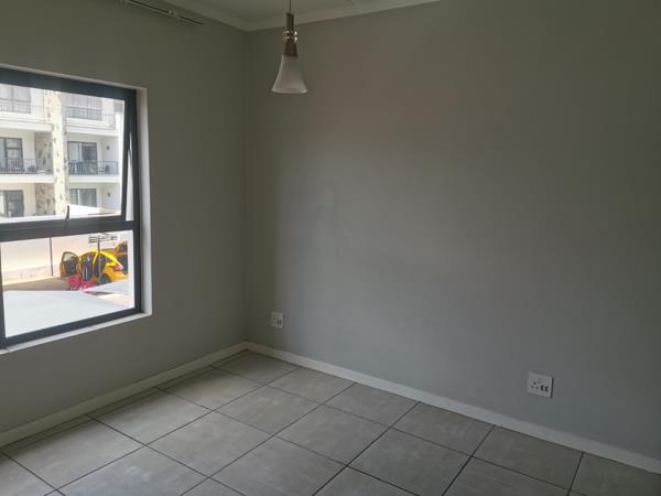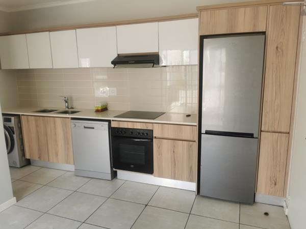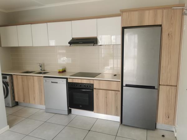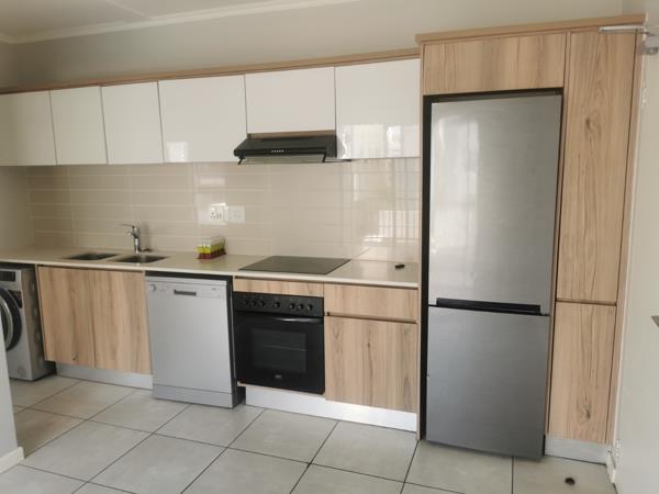 Discover modern living in this stylish 1-bedroom, 2-bathroom apartment, perfectly situated within a desirable estate in Crowthorne AH, Midrand. Spanning 33 square meters, this unfurnished unit offers a well-designed layout featuring a comfortable lounge and a contemporary kitchen. The kitchen boasts sleek two-tone cabinetry in wood grain and glossy white, complemented by integrated appliances including an oven, hob, extractor fan, and dishwasher. A stainless steel fridge and space for a washing machine are also provided. The living spaces and bedroom feature neutral grey walls and durable grey tiled flooring, creating a clean and inviting atmosphere.