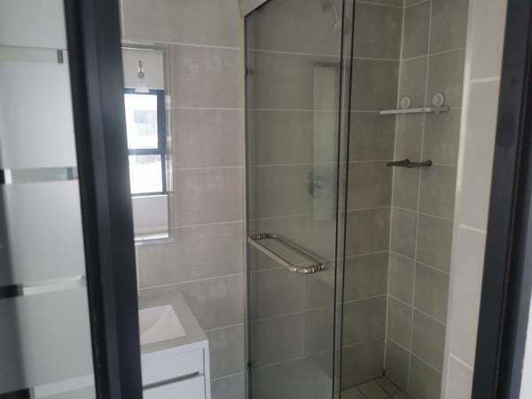 The apartment includes one spacious bedroom and two modern bathrooms, one en-suite. Both bathrooms feature contemporary grey tiled walls, glass-enclosed showers, and elegant white vanities. Large windows allow for ample natural light. Enjoy private outdoor space with a dedicated balcony. This property offers an exceptional lifestyle within a vibrant estate, benefiting from a large, sparkling communal swimming pool with unique stepping stone features, ample outdoor seating, and a clubhouse. Security is paramount, with 24-hour security, an access gate, and a security gate. This pet-friendly apartment is ideal for professionals or individuals seeking a convenient lock-up-and-go lifestyle, complete with one dedicated parking bay.