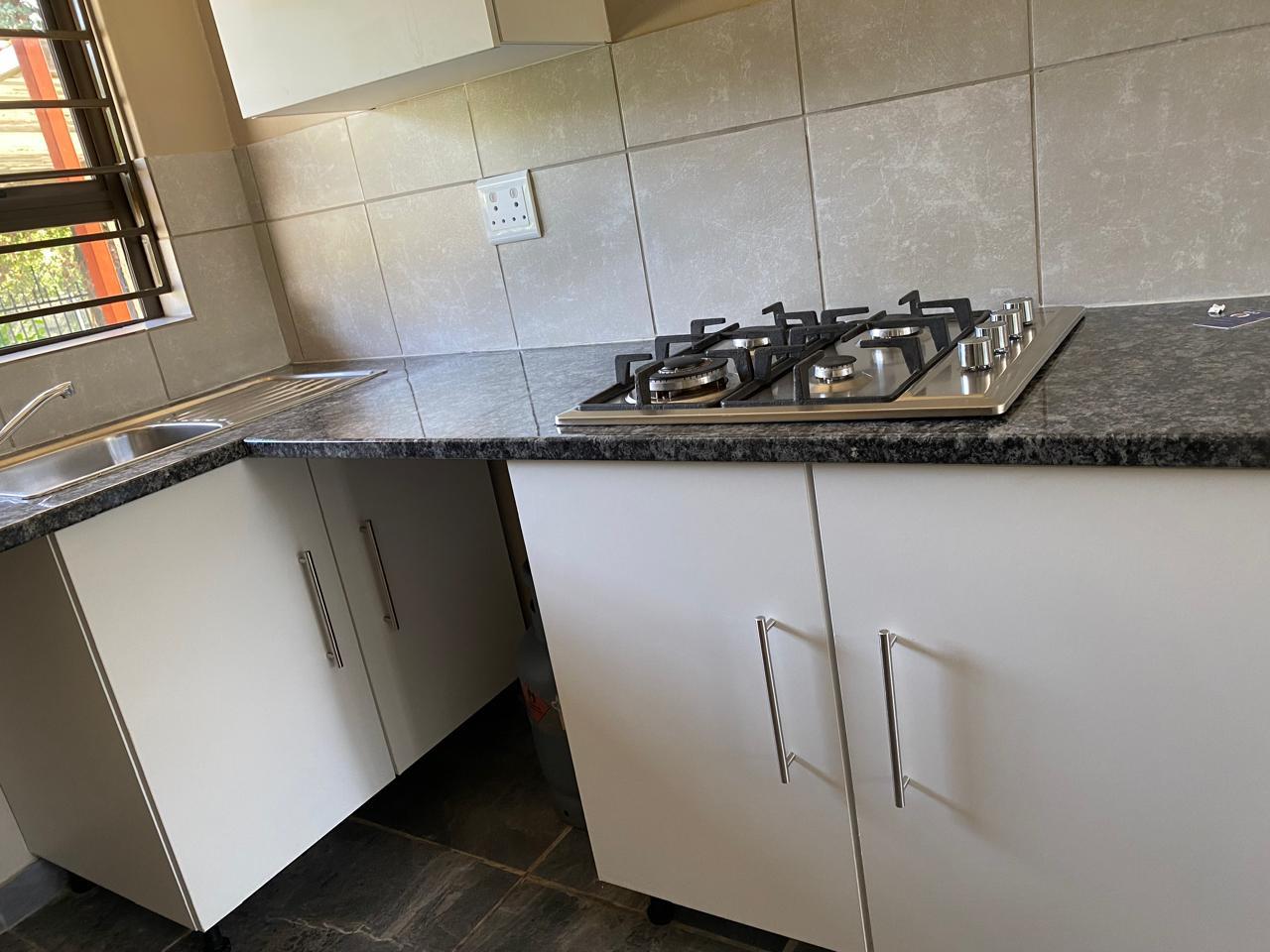 kichen with a gas stove and enough cupboard space