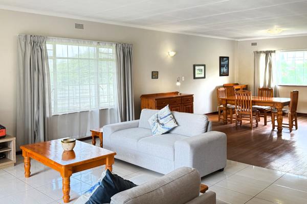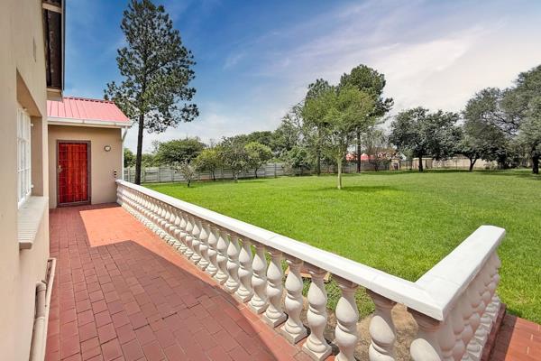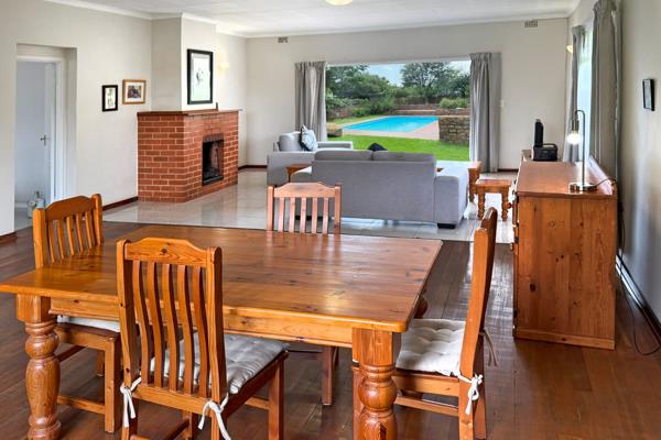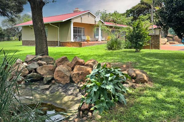 The outdoor space is perfect for relaxation and entertaining, featuring a swimming pool, braai area, and a large open yard with trees and a well-kept lawn.