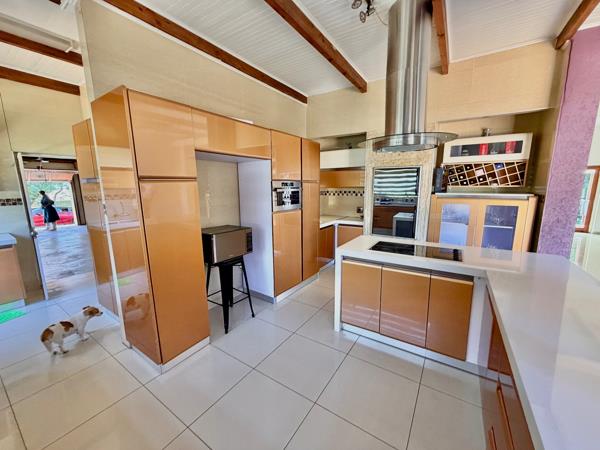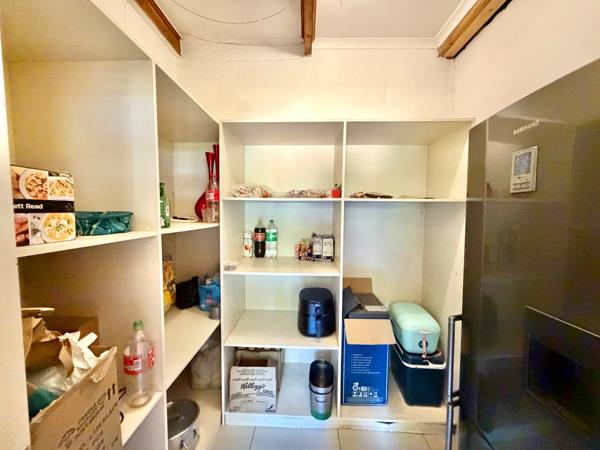 The large kitchen is clean, airy, and tastefully finished, featuring ample cupboard space and a separate scullery for added practicality.