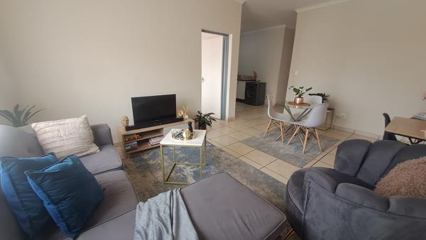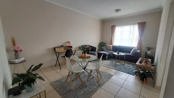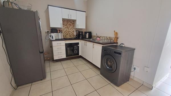 Discover comfortable living in this modern 2-bedroom, 1-bathroom apartment, ideally situated within a secure complex in Grand Central, Midrand. Spanning 65 square metres, this well-appointed unit features an open-plan lounge and dining area, creating a spacious and inviting atmosphere for daily living and entertaining. The contemporary kitchen is equipped with white cabinets, dark countertops, a tiled backsplash, and includes space for essential appliances such as a refrigerator, built-in oven, and washing machine, ensuring convenience. Tiled flooring extends throughout the apartment, offering a clean and low-maintenance finish. Both bedrooms are fitted with built-in wardrobes, providing ample storage solutions.