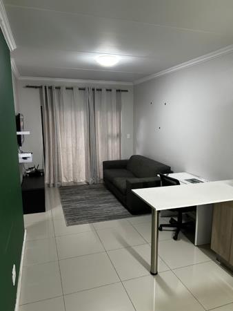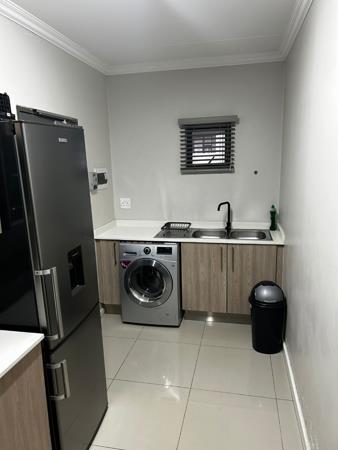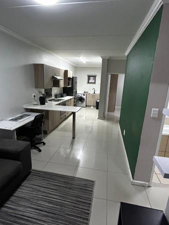 Discover modern living in this well-appointed 2-bedroom, 2-bathroom apartment located within a desirable estate in Halfway Gardens, Midrand. This contemporary unit offers an efficient open-plan layout, designed for comfort and convenience. The sleek, modern kitchen is equipped with integrated stainless steel appliances, including an oven, hob, extractor fan, and a washing machine. Light wood cabinetry, white countertops, and a stylish black marble-look backsplash complete this functional space, complemented by a versatile countertop extension for dining or a dedicated workspace. The open-plan living area boasts clean tiled flooring, a contemporary grey and white colour scheme, and a subtle accent wall, with natural light from a large window.