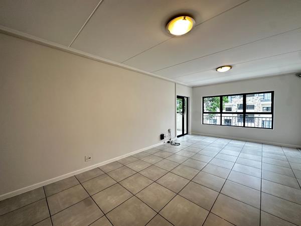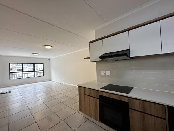 The apartment features a spacious open-plan layout with a stylish kitchen equipped with Caesarstone countertops, ample cupboard space, and appliances (including a stove, oven, and extractor, Defy fridge, dishwashing machine and clothing washing machine). The living and dining area flows effortlessly onto a large covered balcony, ideal for entertaining guests or relaxing outdoors.