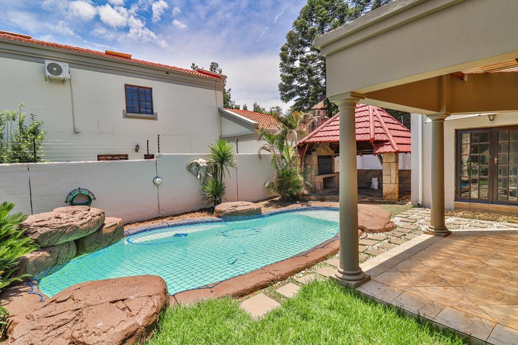 - Living area with two lounges overlooking retreat like beautiful garden with a blue sparkling pool and a lapa. Perfect for entertaining your guests.
