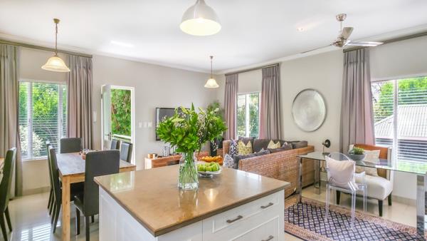A modern, exquisitely furnished airy and spacious 2 bedroom 1.5 bathroom apartment that has all the bells and whistles. Own private entrance, air conditioning/heating in both bedrooms, open plan living space, own private balcony, solar, borehole water and electricity, Wi-fi, DSTV, and Netflix all included in the rental, in an extremely high security estate.