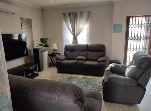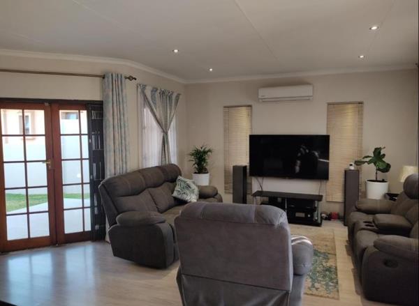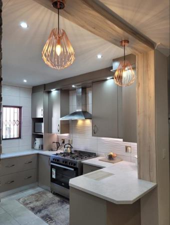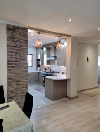 Brand new kitchen boasting 900mm gas stove and lovely modern finishes. Open plan living area with wood laminate flooring, along with a charming fireplace and ambient lighting. The dining area can accommodate a 6 to 8 seater table.