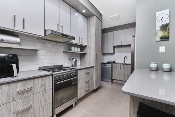 Modern kitchen, with ample cupboard space, gas hob, room for 3 appliances and breakfast bar