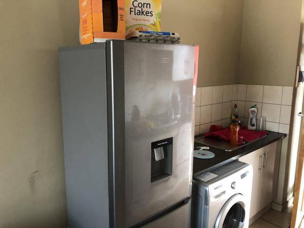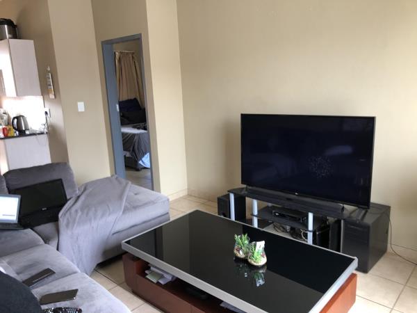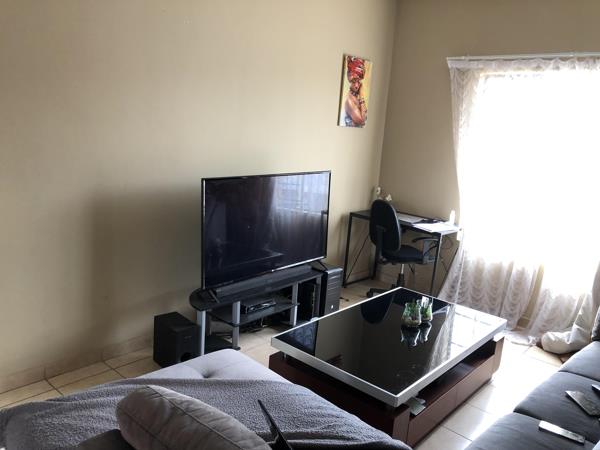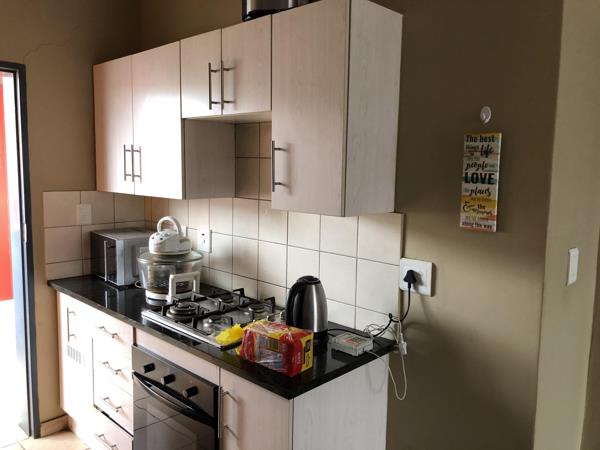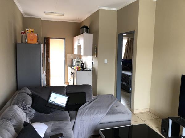 Well taken care of top floor apartment offers a spacious bedroom that can comfortably fit a King bed with side tables and a study work desk along with a full en-suite bathroom bathtub and shower. This apartment boasts a large open plan living room that can easily fit a large L-shape couch and small 2-4 seater table and chairs along with a cozy kitchen with a single under counter appliance space and a gas stove to beat the loadshedding. The unit also has a small nook by the front door to sit at for fresh air and comes with a single covered carport with lots of open parking available for a 2nd car or visitors.