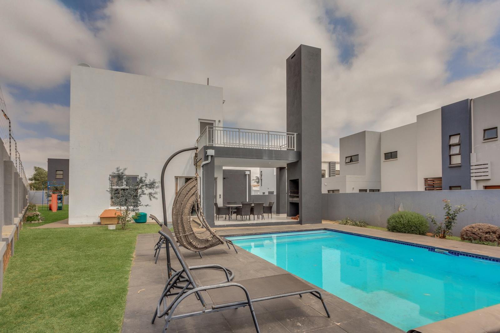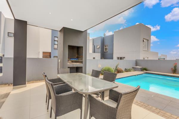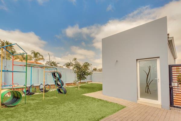 The lounge opens up to a covered patio, complete with a built-in braai, perfect for weekend gatherings. Step outside to find a large pool, providing a refreshing escape on hot summer days, alongside plenty of play area for the kids. A jungle gym in the backyard ensures hours of fun for the little ones.