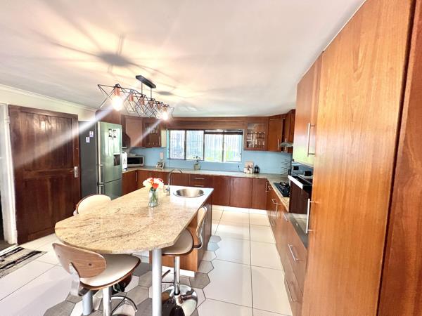 The modern kitchen features a large island, breakfast nook, new gas hob, new eye-level oven, space for a double-door fridge, and a separate scullery for laundry.