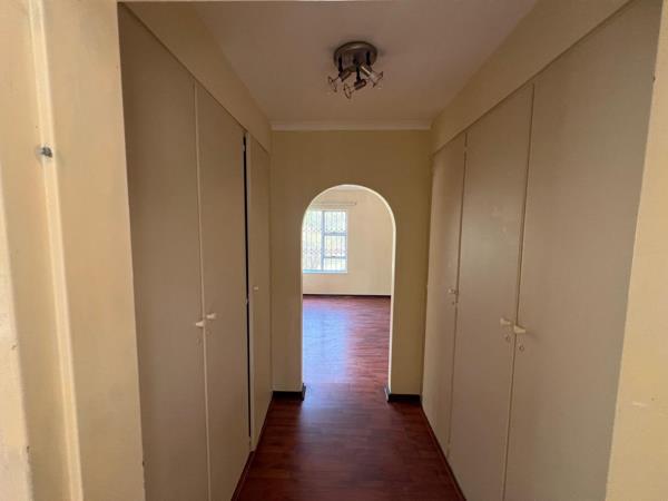 The U-shaped kitchen, while functional, presents a canvas for personalized culinary expression, boasting ample cabinetry and durable countertops, illuminated by a large window with security bars. The home features elegant tiled and laminate wood flooring throughout, enhancing its contemporary appeal. Both bedrooms are generously proportioned, offering serene retreats, with one benefiting from a private en-suite bathroom. Ample built-in storage solutions are thoughtfully integrated into the hallways, ensuring a clutter-free living environment.