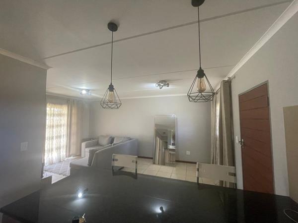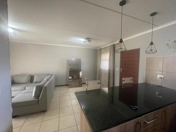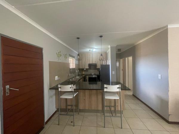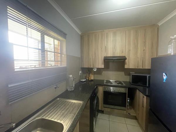 The unit features two spacious bedrooms with built-in cupboards, providing ample storage space. The bathroom is neat and functional, designed for everyday comfort. The open-plan living area creates a warm and inviting atmosphere, flowing seamlessly into the kitchen, making it ideal for both relaxing and entertaining.