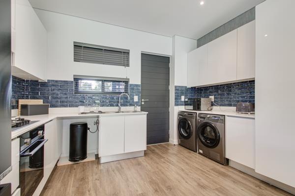 Modern kitchen equipped with washing machine, dryer, and double-door fridge