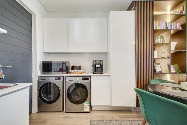 Modern kitchen equipped with washing machine, dryer, and double-door fridge