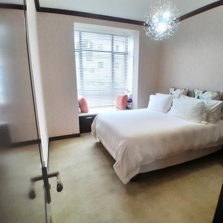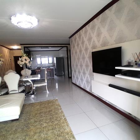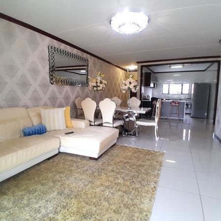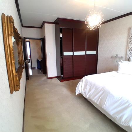 The luxurious apartment opens to a seamless open plan kitchen, loungedining area that flows to a covered balcony that overlooks a beautiful common garden. The kitchen is fitted with lots of cupboards, washing machine, dish washing machine and a double door fridge. Kitchen appliances, crockery, cutlery and pots will be available. The lounge and dining area is tastefully furnished to cater for the executives, and opens its shutter sliding doors to a spacious balcony.