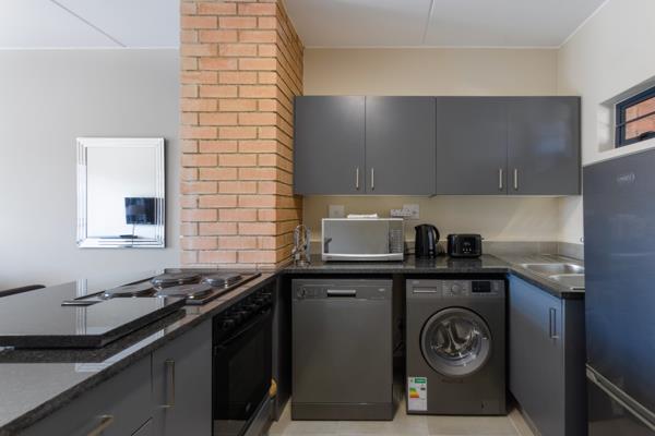 Spacious open plan kitchen with ample cupboards and space for 2 appliances