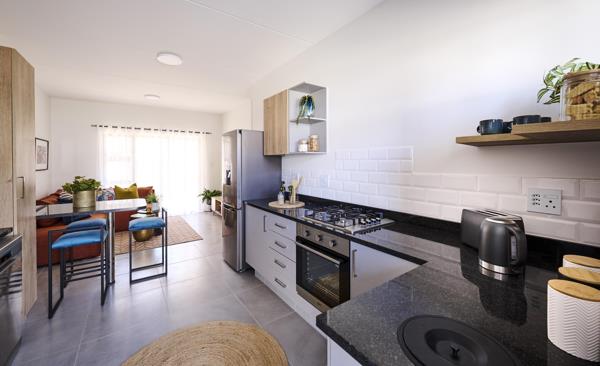 Modern Open-Plan Kitchen: Featuring sleek granite countertops, a gas stove, space for a single door fridge, and ample cupboard space with room for two appliances.