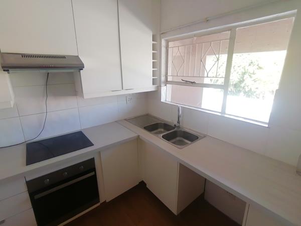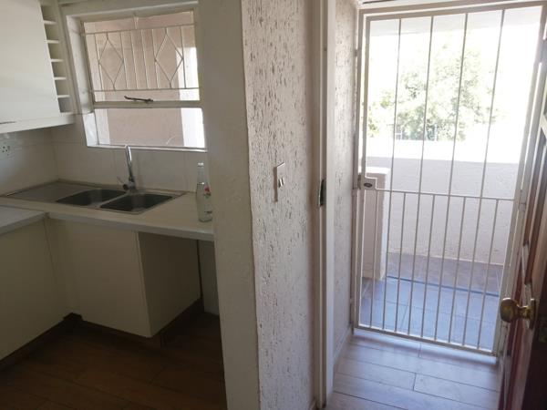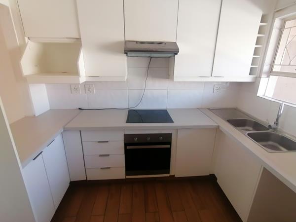 This 2-bedroom apartment is situated in a walled 247 security complex in Vorna Valley. Entering the property via a security gate, you find the kitchen on your right. It has an under-counter oven with glass hob and extractor fan. There are many cupboards and there is place for a fridge and an outlet for a washing machinedishwasher. It has a double sink. The kitchen has a serving hatch through to the living area. The living area opens onto a balcony via a sliding door. The floors of the living areas are laminated wood and the kitchen and bathroom have tiled floors.