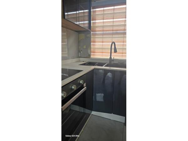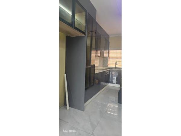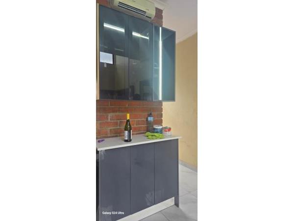 Modern Kitchen and lounge has a beautiful TV stand on wall.