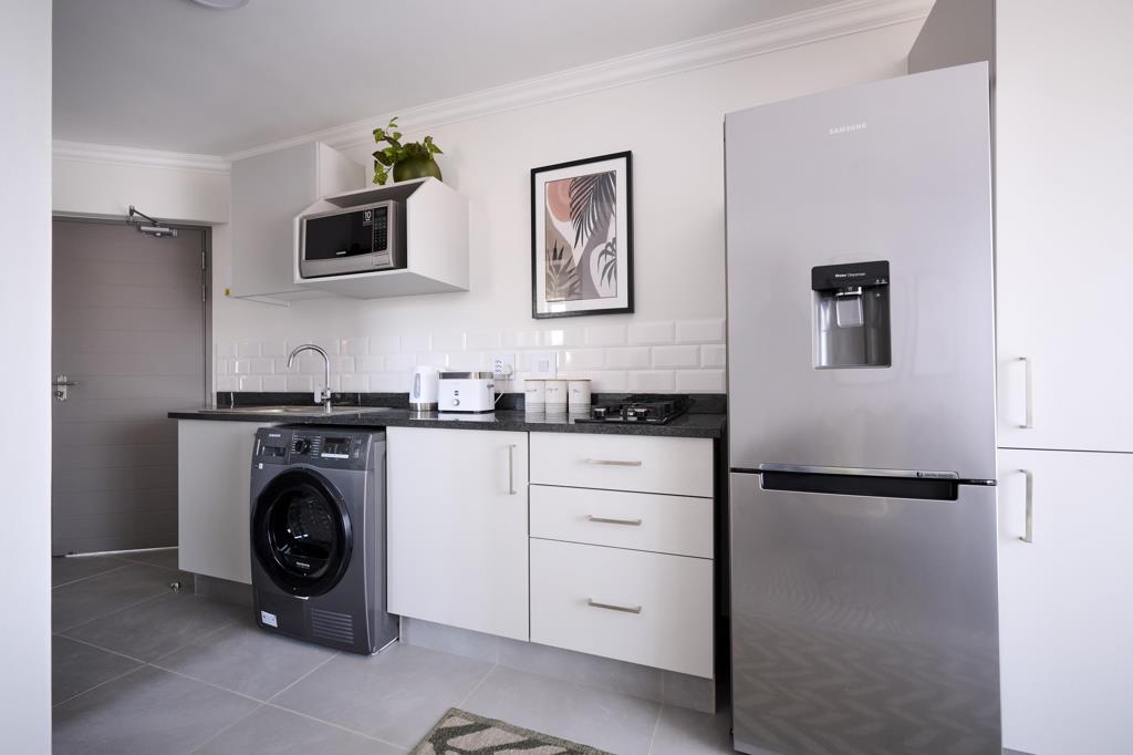 Inside the apartment, contemporary design meets everyday practicality. The modern open-plan kitchen, fitted with quality finishes and space for a front-loader washing machine, flows effortlessly into the loungean inviting space to relax after a long day. Slide open the doors and step onto your private balcony, perfect for morning coffee or evening downtime. The spacious bedroom offers built-in cupboards, while the stylish full bathroom completes the home with a touch of elegance.