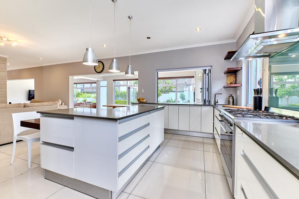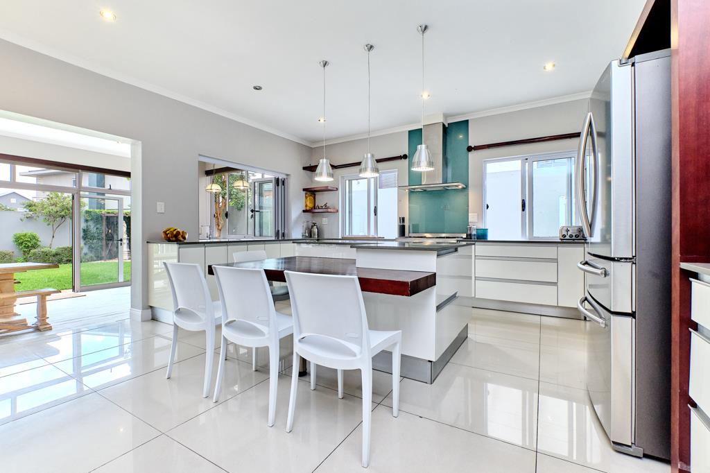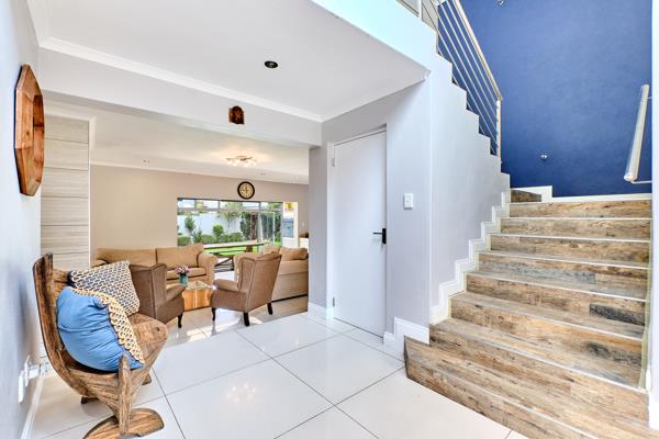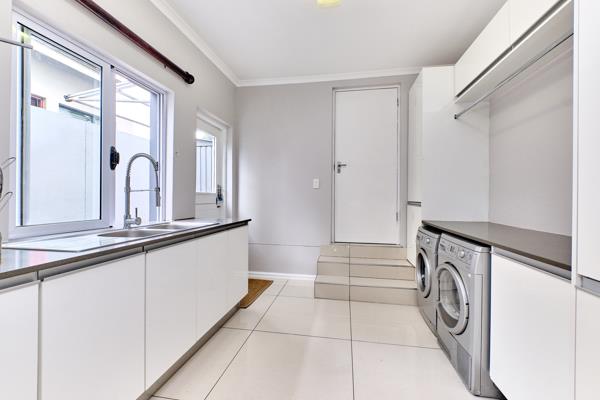 The downstairs area has an open plan design, with a sitting/living area separated from the dining area by a double sided fireplace, ideal for the cooler weather. The home has a spacious enclosed patio that can be opened up fully in the summer time as it leads out onto the garden and pool. The patio has built in gas braai and entertainers work area. The home features a well-designed kitchen equipped with a gas stove, ample cupboard space and a breakfast nook. There is a separate scullery/laundry. The guest bedroom is also situated on this level.