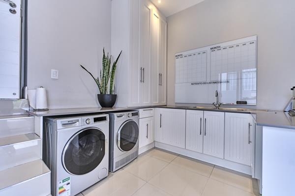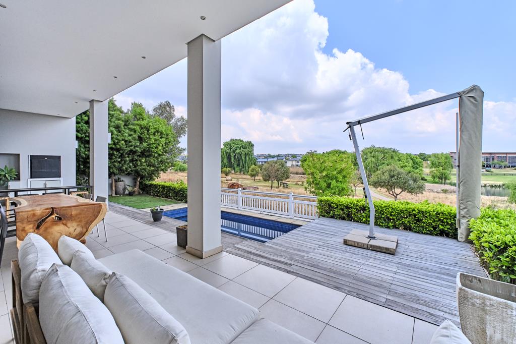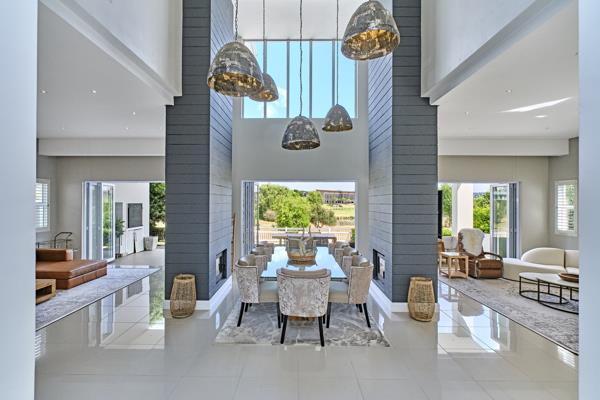 Beautiful family home overlooking the peaceful dam and grassland in the village. An open plan living and entertaining area with spectacular views and stacker doors that open onto the spacious covered patio with gas braai plus a sparkling, solar heated pool. The ground level of the home boasts 2 double sided wood burning fireplaces that ensure warmth throughout the winter months. A chefs kitchen with Smeg appliances, a walk in pantry and separate scullery with additional cupboard space. A guest bedroom with its own private entrance and en-suite bathroom.
