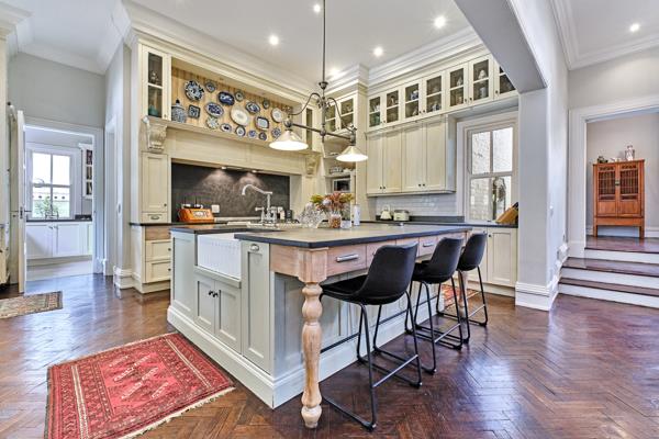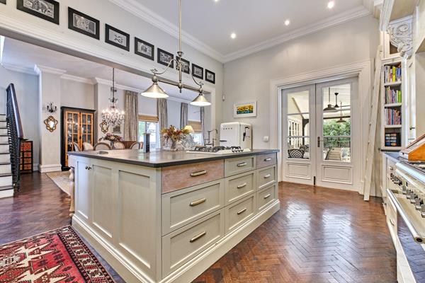 The kitchen features a large centre island, gas hob, and is fully equipped with a separate scullery and laundry.