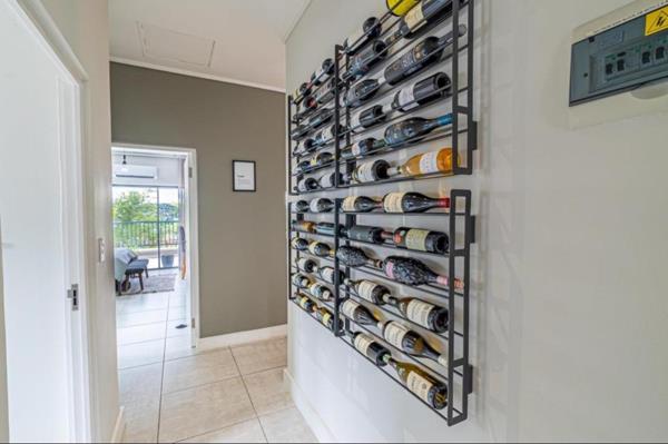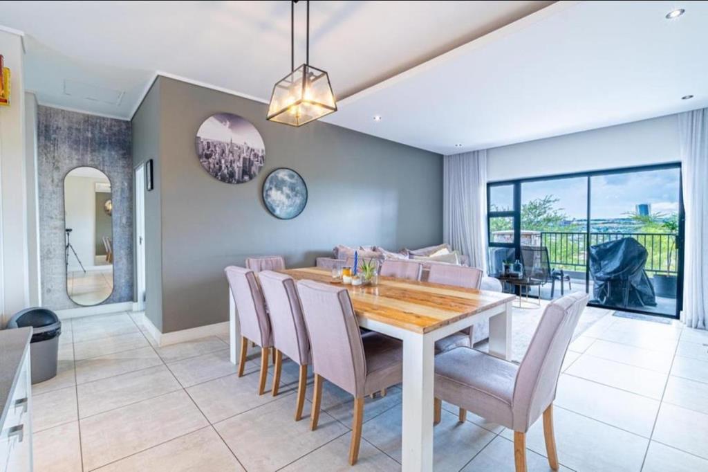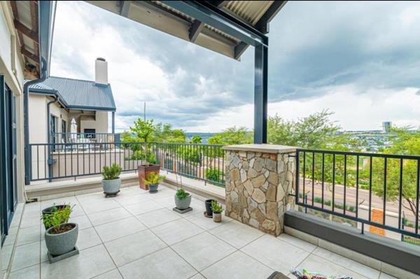 The balcony offers spectacular views of the waterfall and Midrand skyline, providing the perfect setting for dining or relaxation.
