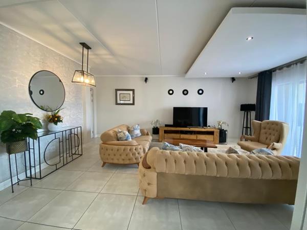 There are three spacious fully tiled bedrooms, each with built-in cupboards, offering comfort and flexibility. The master bedroom with ample cupboard space includes a sleek full en-suite bathroom, while the second and third bedrooms have the use of the 2nd full bathroom.