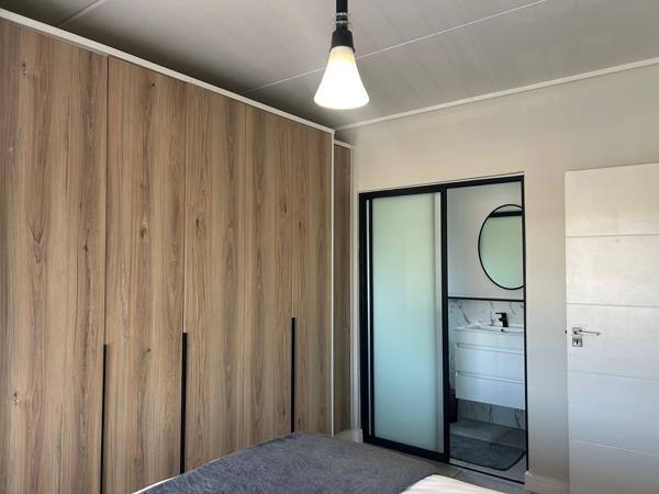 Elegant En-suite Bedroom: Generous built-in cupboards and a stylish bathroom with a shower and basin.