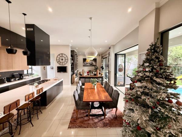 The covered patio complete with a built-in gas braai overlooks a glistening, oversized pool and a beautifully maintained garden with a jungle gym, creating a family haven that feels like your own private retreat.