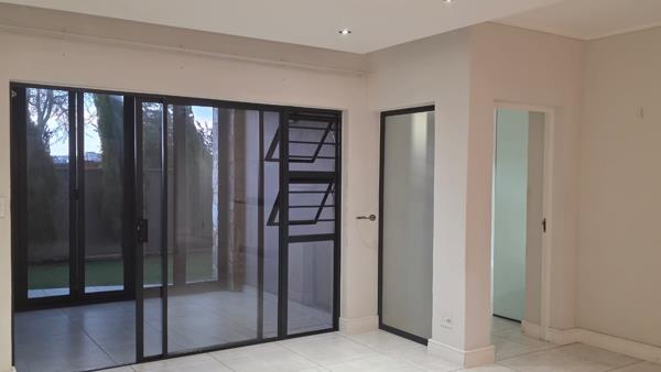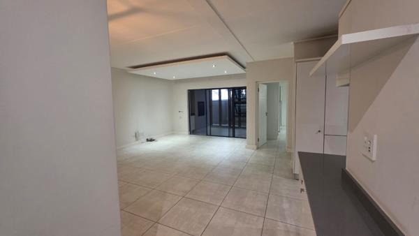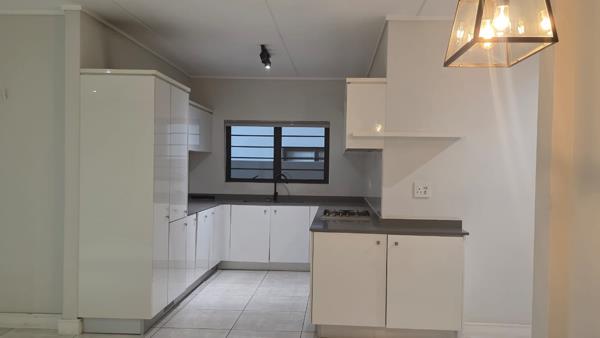 The open-plan living and dining area is bright and inviting, leading onto a private patio that extends your entertainment space. The kitchen features contemporary finishes, quality countertops, integrated appliances, and a layout designed for both practicality and style. The three bedrooms are well-sized with built-in cupboards, and the main suite includes a sophisticated en-suite bathroom. The second bathroom services the additional bedrooms with ease.