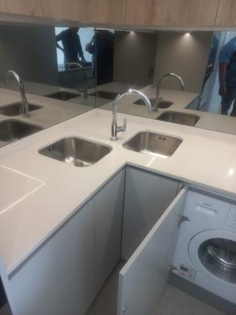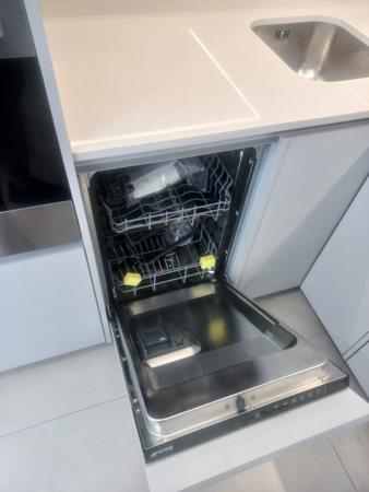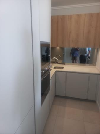 The meticulously designed kitchen is a testament to modern elegance, featuring sleek white flat-panel cabinetry, pristine light-coloured countertops, and a striking mirrored backsplash that amplifies the sense of space. Equipped with top-tier integrated Smeg appliances, including an oven, microwave, dishwasher, and washing machine, it promises a culinary experience of effortless luxury. The apartment boasts clean tiled flooring throughout, complemented by contemporary track lighting and air conditioning, ensuring comfort and style in every season.