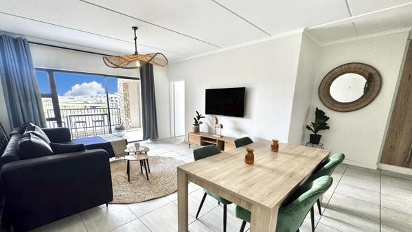 The apartment features two bedrooms with built-in cupboards, including a main bedroom with an en-suite spa bath. The open-plan lounge and dining area flow seamlessly onto a private balcony, perfect for relaxing or entertaining while enjoying the stunning water views. The modern kitchen is fully equipped with appliances, complemented by a study, entrance hall, and convenient staff quarters. For energy efficiency, a solar geyser is included, and the apartment is fibre ready.