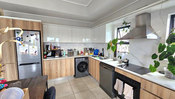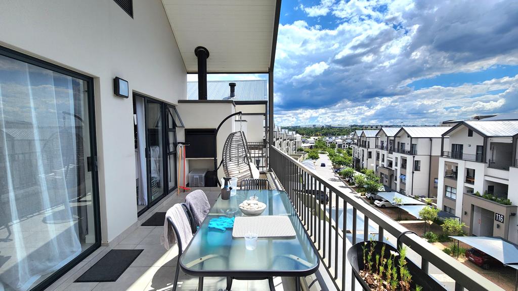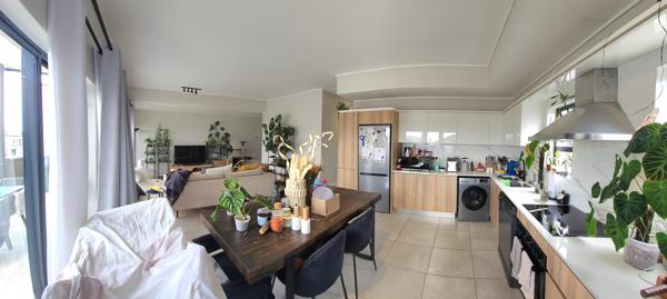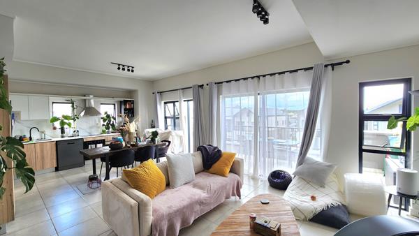 The apartment features a well-designed open-plan layout that seamlessly connects the kitchen, dining, and living areas, creating a comfortable and airy living space. Large sliding doors open onto a generous top-floor balcony, complete with a built-in braai area and elevated views, making it ideal for entertaining or enjoying relaxed outdoor living.
