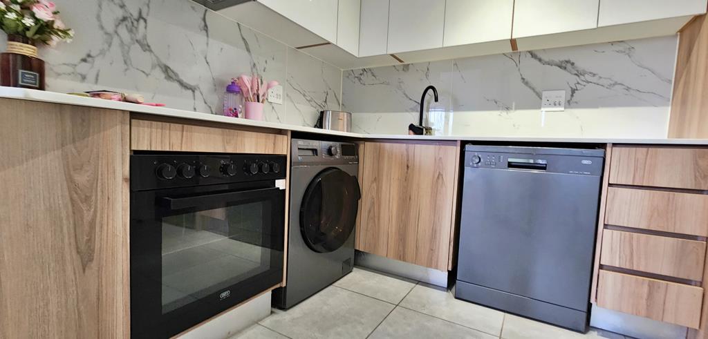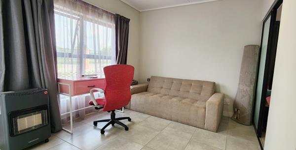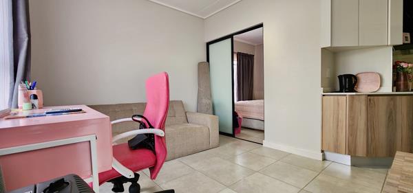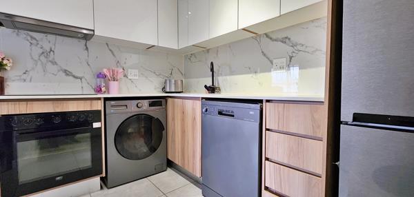 The open-plan kitchen is fully equipped with high-end appliances, including a Defy fridge, dishwasher, and washing machine, as well as loads of cabinetry space and seamlessly blends into the living space. The bright and airy lounge extends onto a small seating balcony through sleek glass sliders, offering a perfect spot to unwind. The unit is DSTV & WiFi ready and is supplied with a backup power supply.