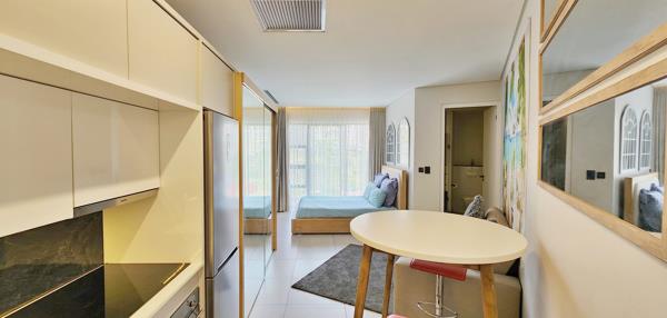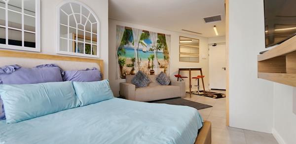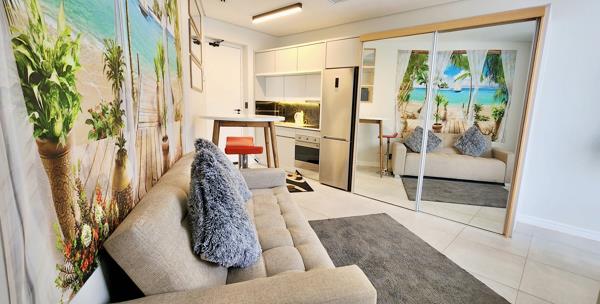 The contemporary kitchen is both elegant and functional, featuring sleek white gloss cabinetry, stone countertops, and high-end SMEG appliances. Cleverly designed, the open-plan layout maximises space and flow, seamlessly incorporating mirror-fitted sliding cupboards, a comfortable lounge area, and a serene sleeping zone. Large glass sliding doors lead out to a private balcony, inviting abundant natural light and enhancing the apartments bright, airy feel.