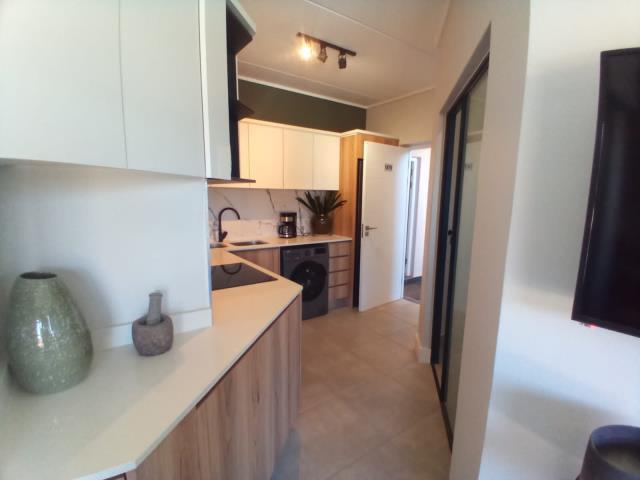 Experience refined modern living in this elegant upstairs apartment, perfectly positioned within a secure and sought-after estate. The residence features a spacious bedroom with sleek built-in cupboards and a beautifully appointed bathroom showcasing contemporary finishes. A sophisticated open-plan kitchen, complete with quality appliances, flows effortlessly into the dining and lounge area, extending onto a covered balcony ideal for stylish outdoor entertaining. A single covered carport is included, with prepaid water and electricity for convenience and control.