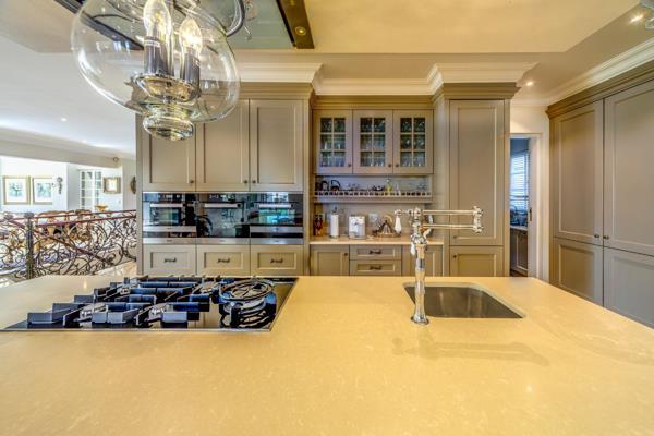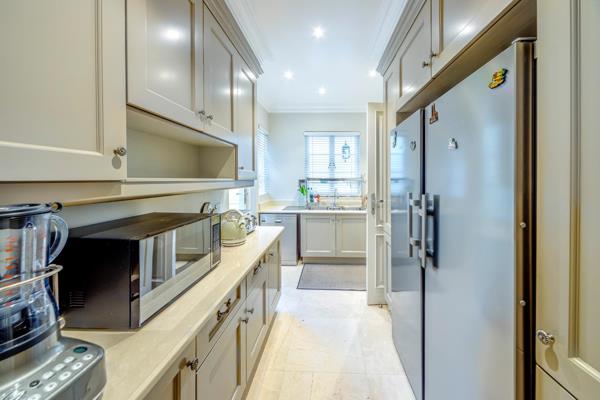 A covered patio with a built-in gas braai opens to the outdoor area, making it perfect for alfresco dining and entertaining. The TV lounge, featuring a wood fireplace, offers a warm and inviting space for family relaxation. The open-plan kitchen is equipped with top-of-the-line Miele appliances, a gas stove, integrated fridge, and freezer. A separate scullery with a pantry, along with a separate laundry room and store room, add to the home''s functionality and convenience.