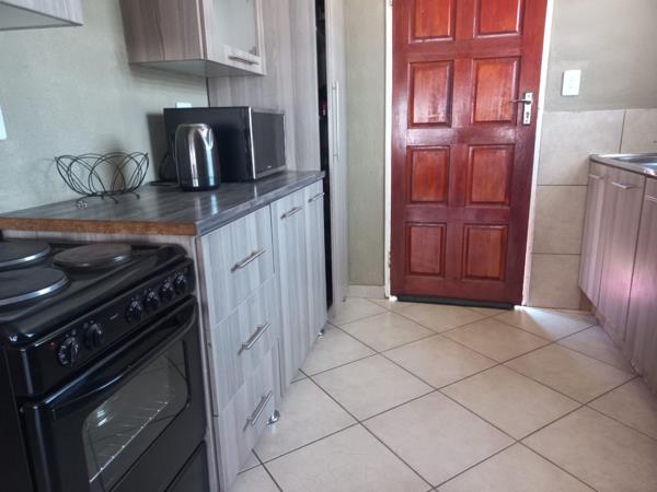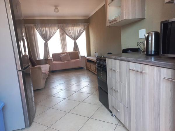 Upon entering, you are welcomed by an open-plan lounge and kitchen, fitted with neat built-in cupboards and a stoveperfect for comfortable living.