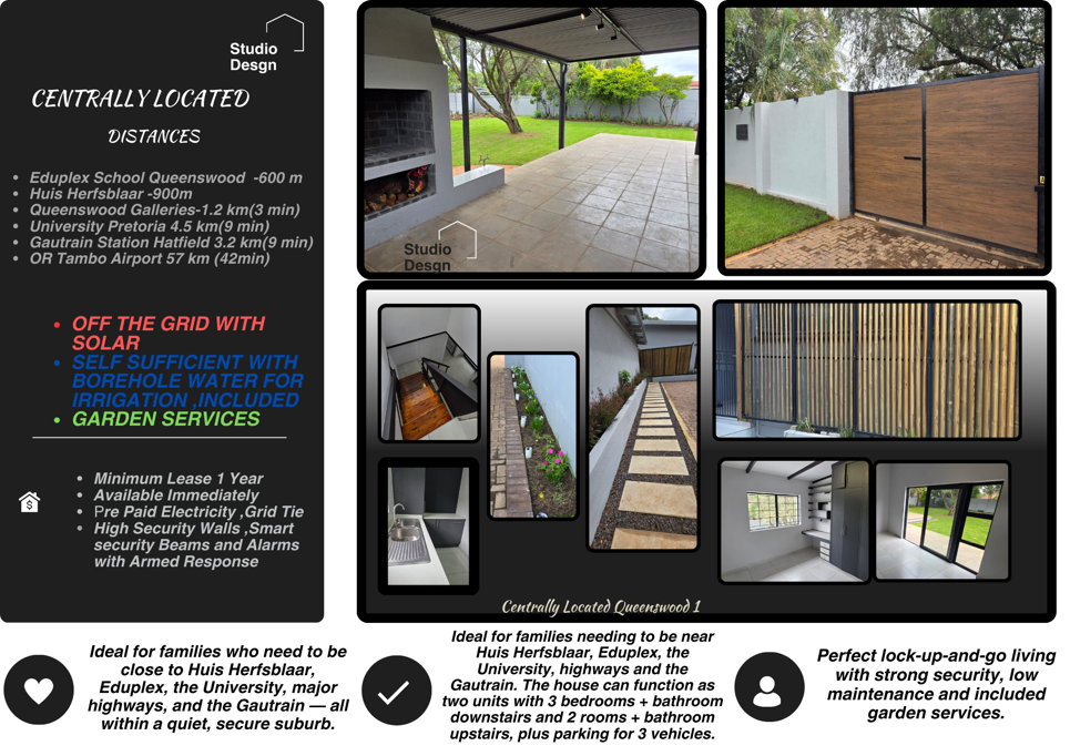 Experience contemporary living at its best in this fully modernized 5-bedroom home, perfectly located within walking distance of Eduplex, Huis Herfsblaar, major transport routes, and the Hatfield Gautrain Station. Designed for comfort, energy independence and security, this property is ideal for families, professionals, or dual-living arrangements.