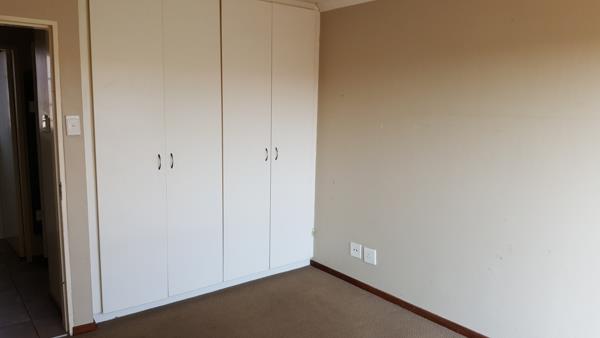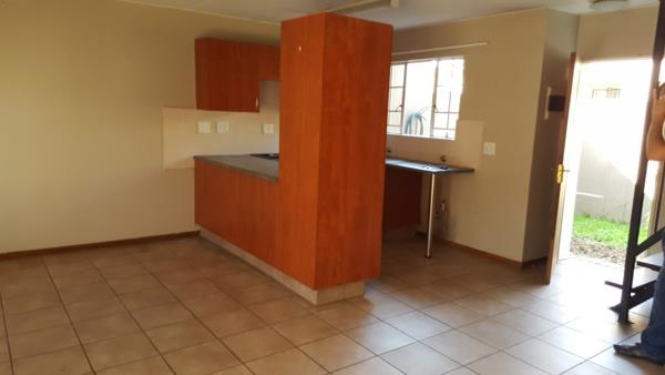 Duplex to rent in Annlin in Sagewood villas it is a two bedroom with build in cupboards and a full bathroom upstairs. Down stairs is a guest toilet and a open plan kitchen with build in cupboards and a stove and space for a washing machine. There is a lounge and outside is a small patio and there is a balcony at the main bedroom. There is one garage and one open parking and a small garden. The complex is near schools and shops.