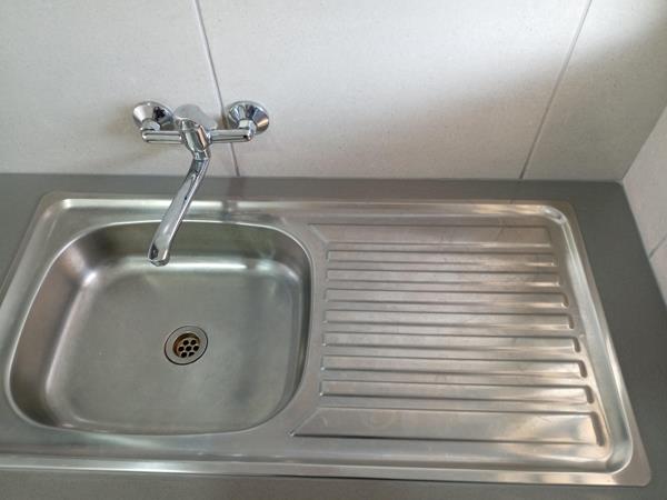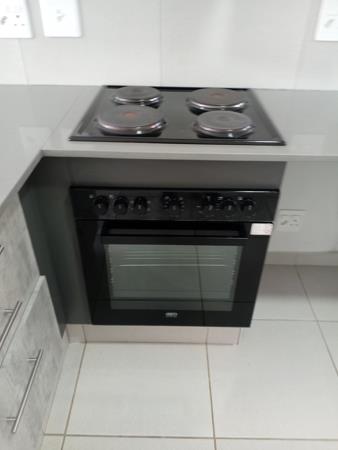 The kitchen has built-in cupboards, an electric stove, an oven, and a washing machine connection. The spacious open-plan lounge is Wi-Fi ready and opens through a sliding door onto the patio.