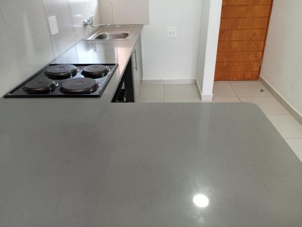 Ground-floor modern 2-bedroom apartment for rent in the La Esquina Residential Complex in Montana, Pretoria. The apartment is fully tiled and features a bathroom plus a dedicated parking space.