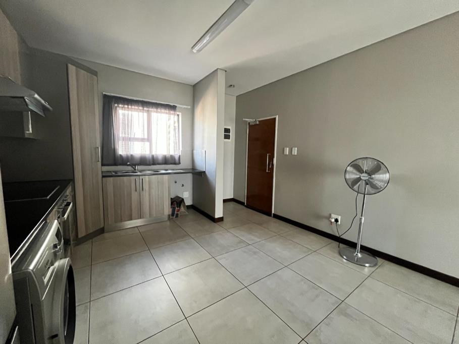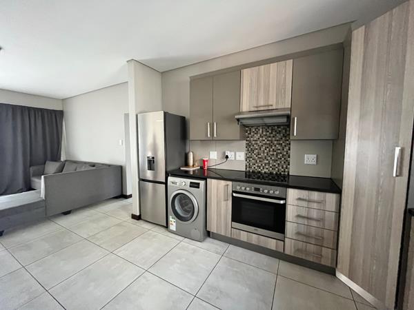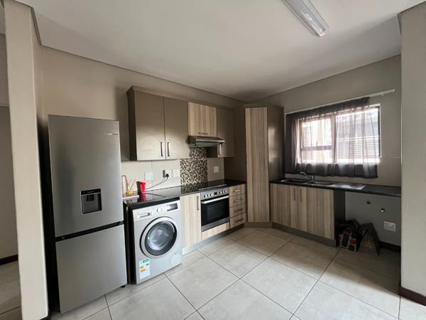 Fully Furnished 2-bedroom, 1-bathroom apartment, spanning 80 square metres, offers a comfortable and modern living experience in the sought-after suburb of Montana, Pretoria. The open-plan design seamlessly connects the living area with a stylish kitchen, featuring modern two-tone cabinetry, sleek dark countertops, and a mosaic tile backsplash. Equipped with stainless steel appliances including an oven, hob, extractor fan, and fridge, the kitchen also integrates a washing machine for convenience. Tiled flooring extends throughout the apartment, ensuring easy maintenance and a clean aesthetic.